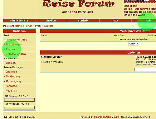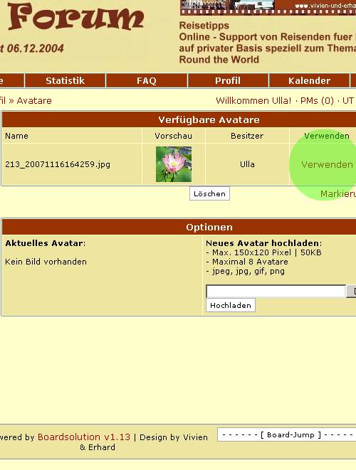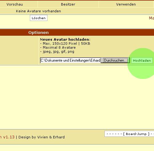 1. Du musst "eingelogt" (angemeldet) sein. Achtung: Das Bild darf von den Abmessungen nicht mehr als 150x120 Pixel , und nicht mehr als 50 KB haben!